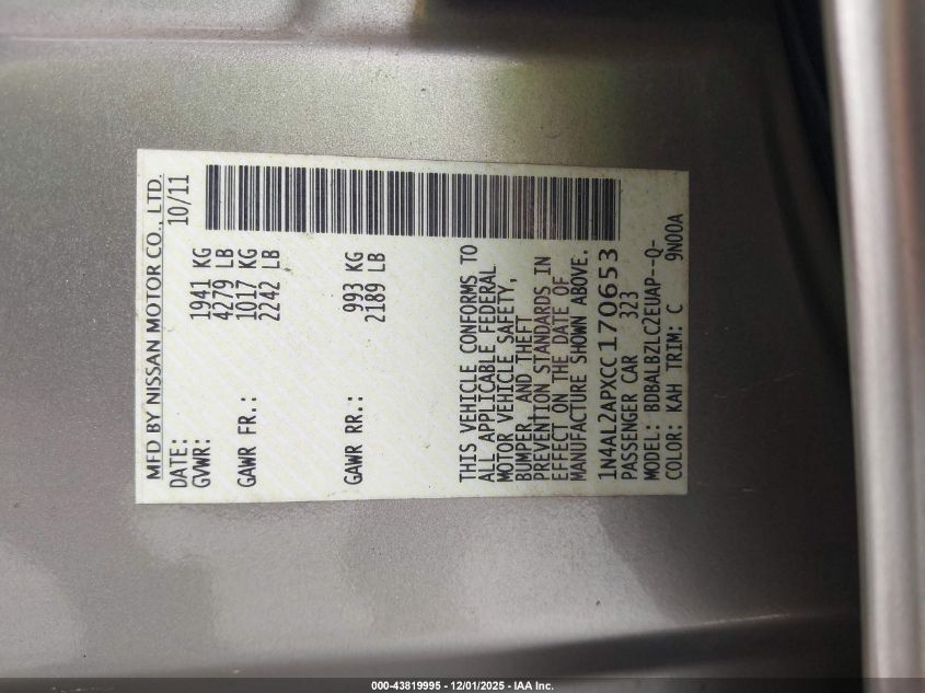 2012 NISSAN ALTIMA 2012 року Бензин, 2.5, Передний привод, vin - 1N4AL2APXCC170653 из США