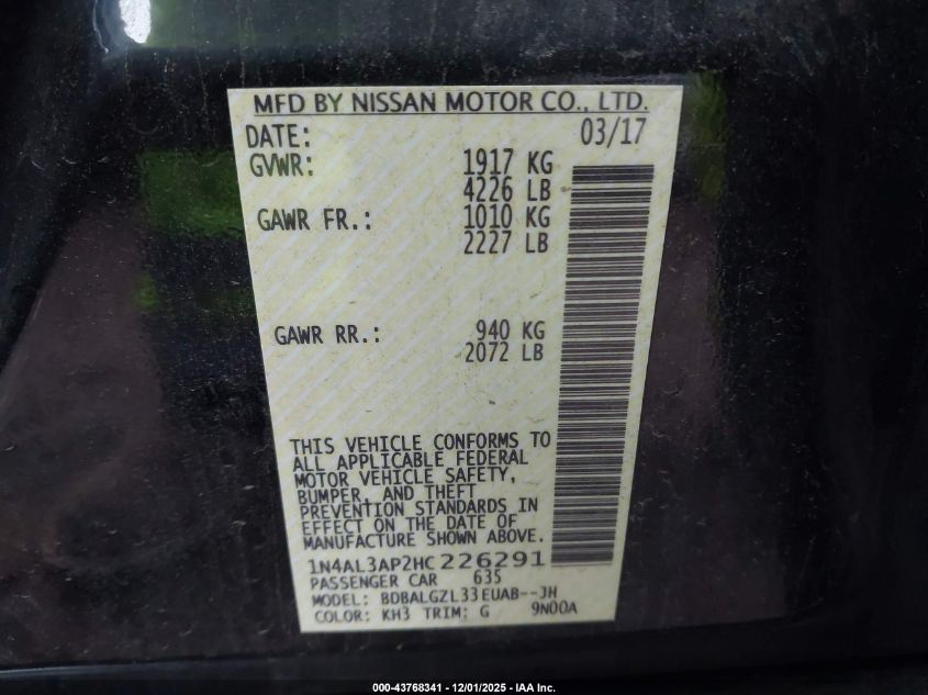 2017 NISSAN ALTIMA 2017 року Бензин, 2.5, Передний привод, vin - 1N4AL3AP2HC226291 из США