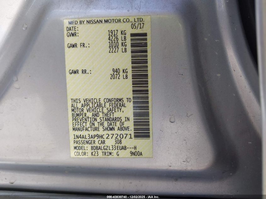 2017 NISSAN ALTIMA 2017 року Бензин, 2.5, Передний привод, vin - 1N4AL3AP9HC272071 из США