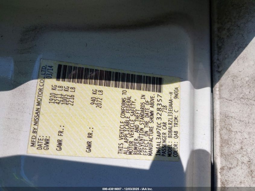2014 NISSAN ALTIMA 2014 року Бензин, 2.5, Передний привод, vin - 1N4AL3AP7EC328357 из США