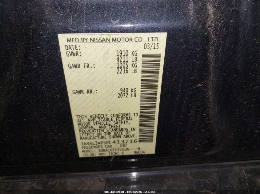 2015 NISSAN ALTIMA 2015 року Бензин, 2.5, Передний привод, vin - 1N4AL3AP5FC413716 из США