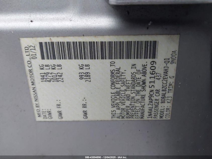 2012 NISSAN ALTIMA 2012 року Бензин, 2.5, Передний привод, vin - 1N4AL2AP9CN511609 из США