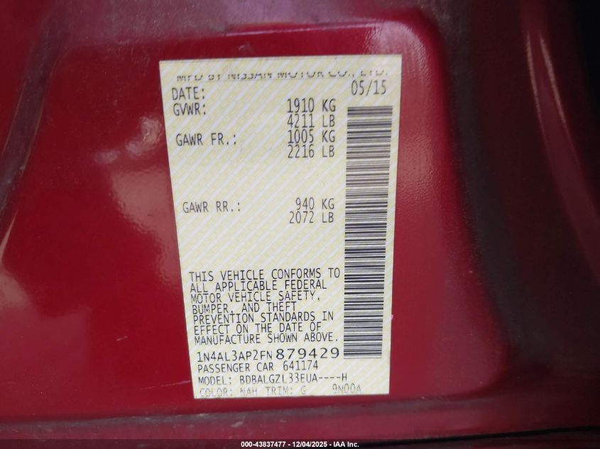 Цвет КрасныйЦилиндры 4Привод Передний приводVIN 1N4AL3AP2FN879429Состояние СтационарноПовреждения Передняя и задняя AutoRIA