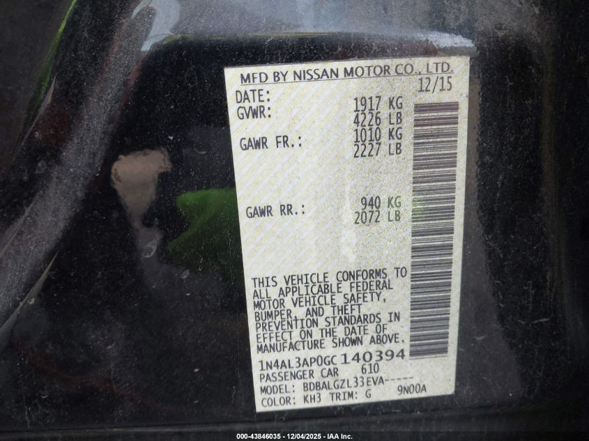 Цвет ЧерныйЦилиндры 4Привод Передний приводVIN 1N4AL3AP0GC140394Состояние СтационарноПовреждения Передняя или задняя AutoRIA