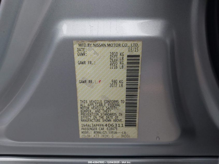 2015 NISSAN ALTIMA 2015 року Бензин, 2.5, Передний привод, vin - 1N4AL3AP4FN406311 из США