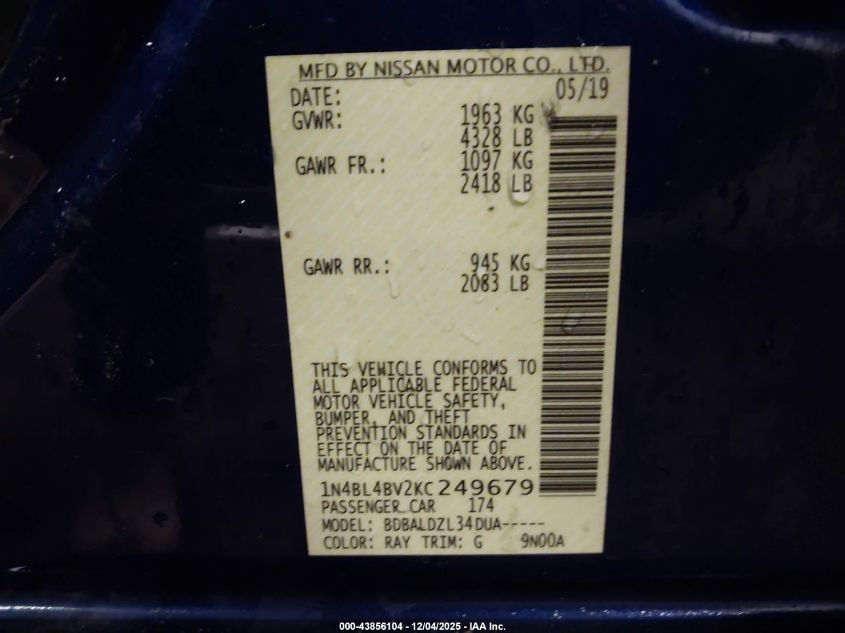 2019 NISSAN ALTIMA 2019 року Бензин, 2.5, Передний привод, vin - 1N4BL4BV2KC249679 из США
