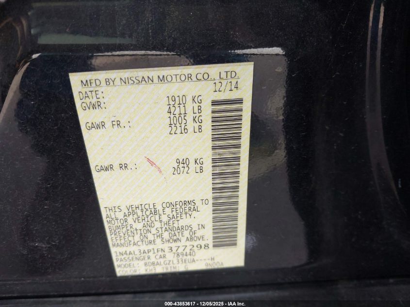 Цвет ЧерныйЦилиндры 4Привод Передний приводVIN 1N4AL3AP1FN377298Состояние СтационарноПовреждения Левая сторона AutoRIA