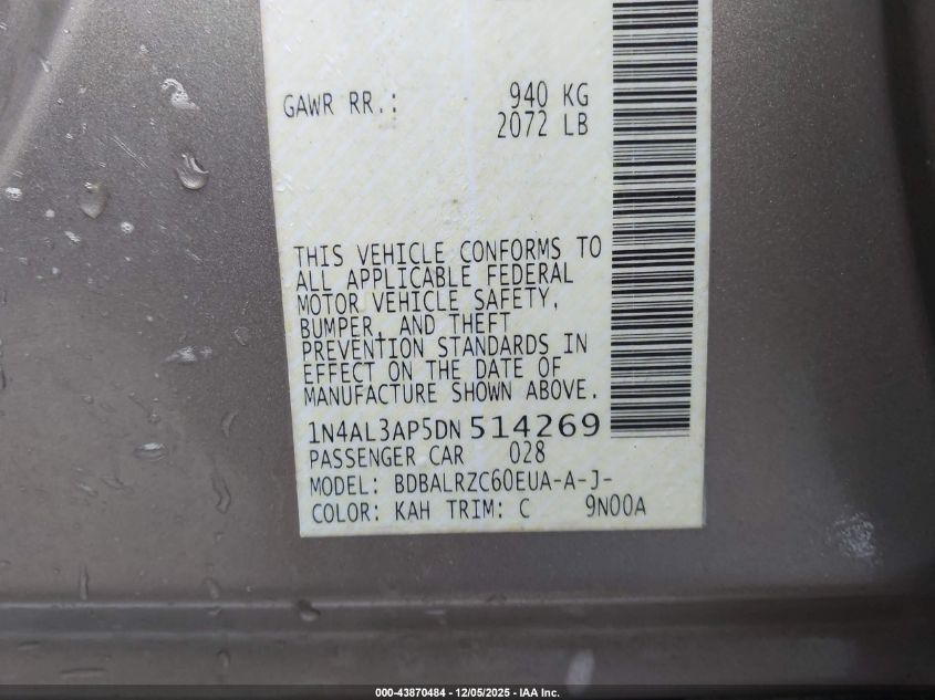 Цвет БежевыйЦилиндры 4Привод Передний приводVIN 1N4AL3AP5DN514269Состояние Заводится и едет (проверено)Повреждения Передняя или задняя AutoRIA