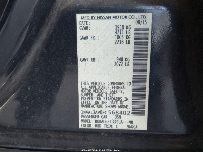 2015 NISSAN ALTIMA 2015 року Бензин, 2.5, Передний привод, vin - 1N4AL3AP0FC568402 из США