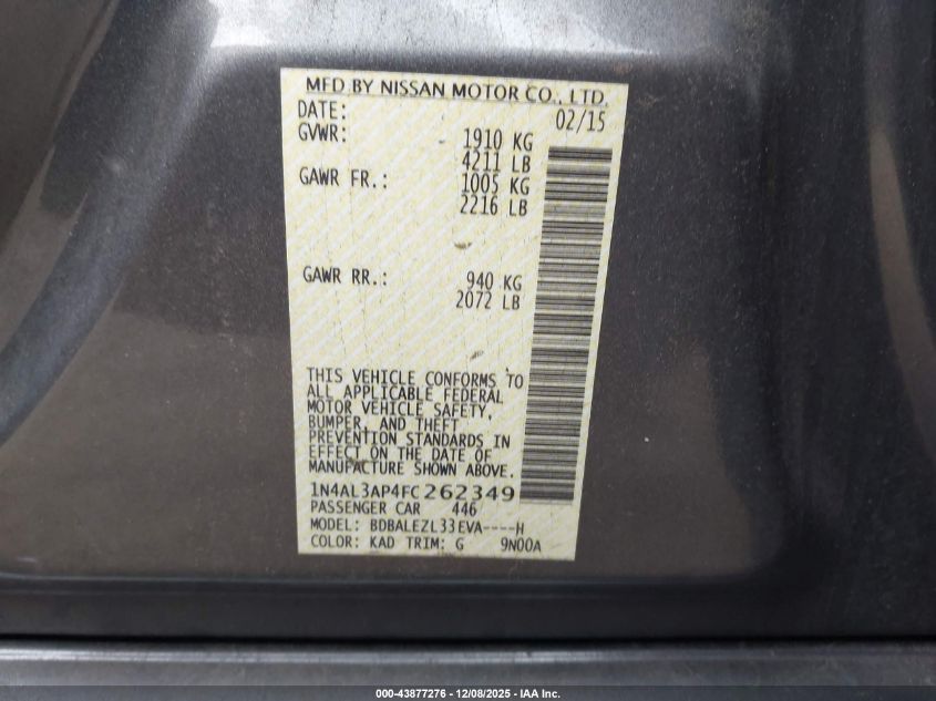2015 NISSAN ALTIMA 2015 року Бензин, 2.5, Передний привод, vin - 1N4AL3AP4FC262349 из США