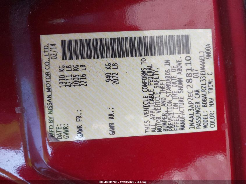 2014 NISSAN ALTIMA 2014 року Бензин, 2.5, Передний привод, vin - 1N4AL3AP2EC288110 из США