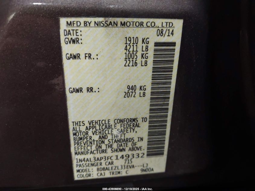 2015 NISSAN ALTIMA 2015 року Бензин, 2.5, Передний привод, vin - 1N4AL3AP3FC149332 из США