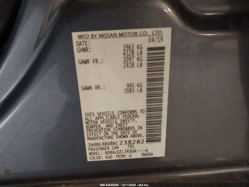 2019 NISSAN ALTIMA 2019 року Бензин, 2.5, Передний привод, vin - 1N4BL4BV8KC238282 из США