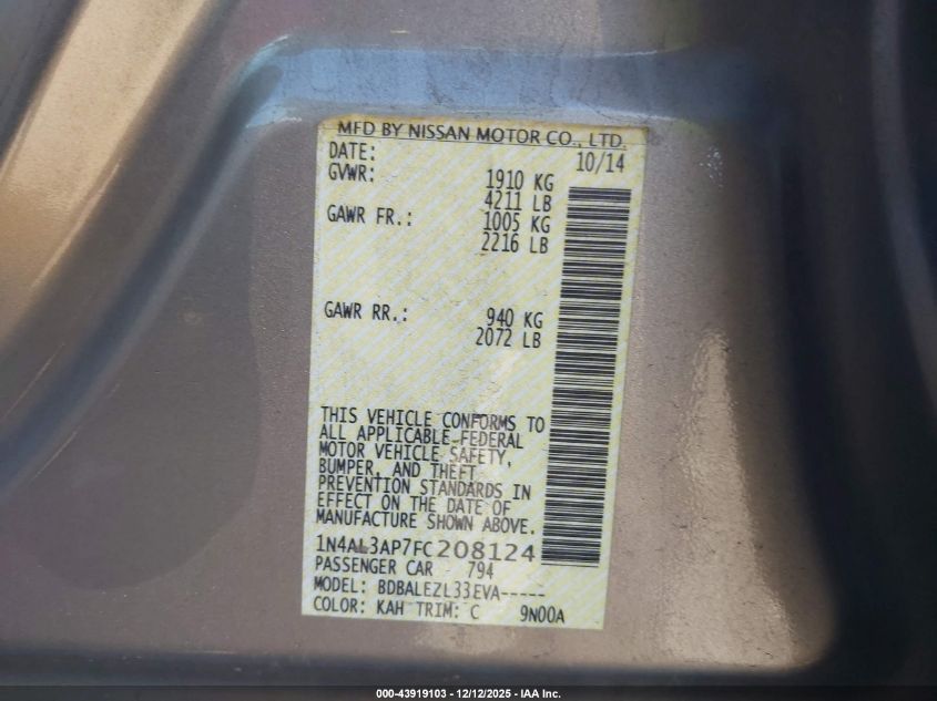 2015 NISSAN ALTIMA 2015 року Бензин, 2.5, Передний привод, vin - 1N4AL3AP7FC208124 из США