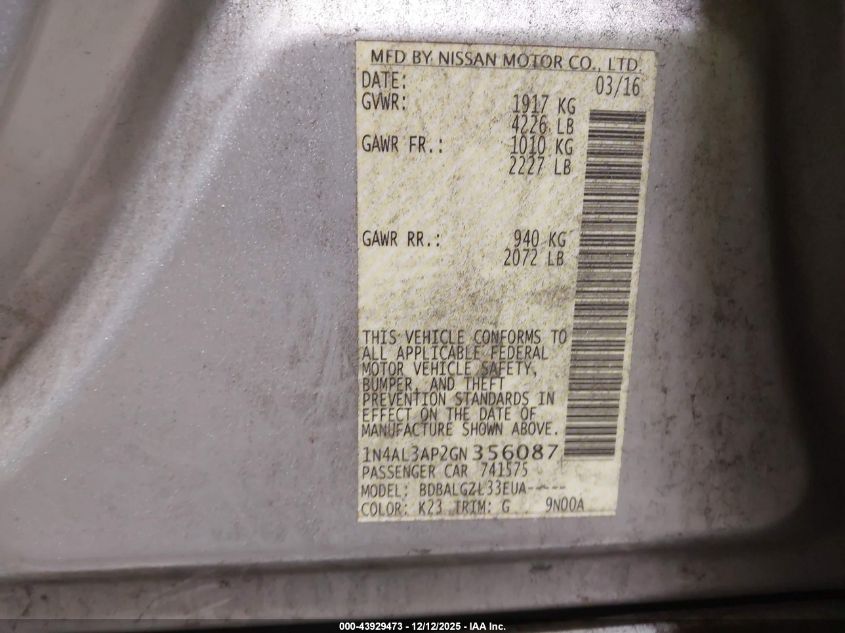 2016 NISSAN ALTIMA 2016 року Бензин, 2.5, Передний привод, vin - 1N4AL3AP2GN356087 из США