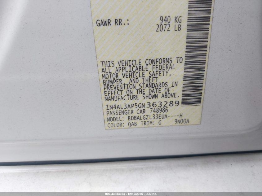 Цвет БелыйЦилиндры 4Привод Передний приводVIN 1N4AL3AP5GN363289Состояние СтационарноПовреждения Передняя правая AutoRIA