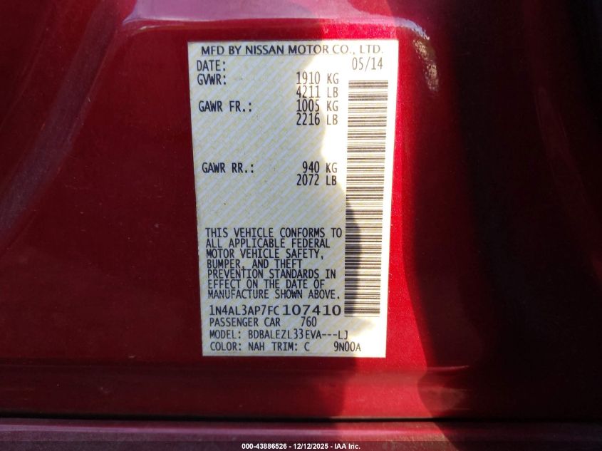 2015 NISSAN ALTIMA 2015 року Бензин, 2.5, Передний привод, vin - 1N4AL3AP7FC107410 из США