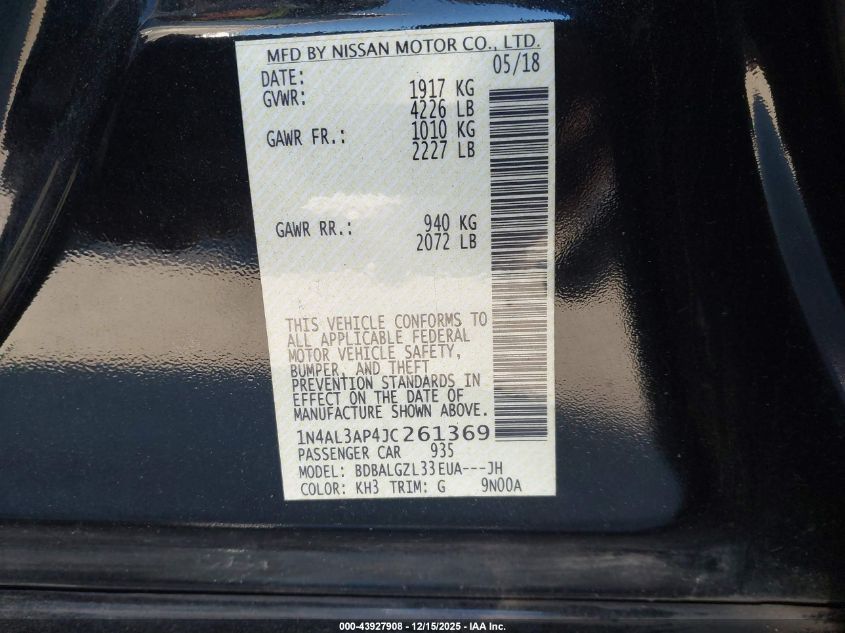 2018 NISSAN ALTIMA 2018 року Бензин, 2.5, Передний привод, vin - 1N4AL3AP4JC261369 из США
