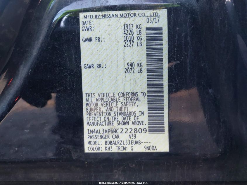 2017 NISSAN ALTIMA 2017 року Бензин, 2.5, Передний привод, vin - 1N4AL3AP6HC222809 из США