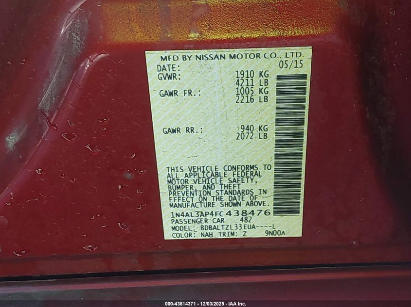 2015 NISSAN ALTIMA 2015 року Бензин, 2.5, Передний привод, vin - 1N4AL3AP4FC438476 из США