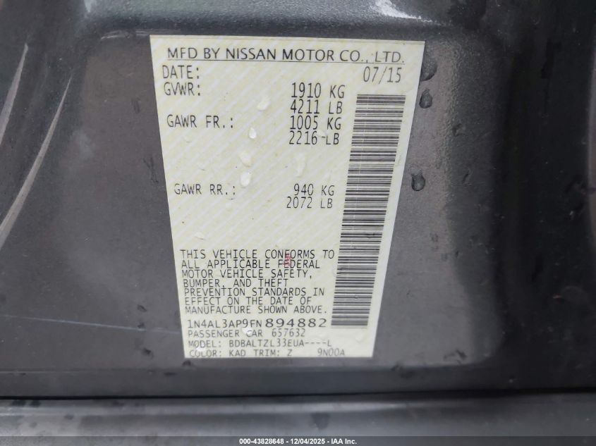 2015 NISSAN ALTIMA 2015 року Бензин, 2.5, Передний привод, vin - 1N4AL3AP9FN894882 из США