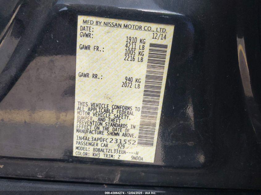 2015 NISSAN ALTIMA 2015 року Бензин, 2.5, Передний привод, vin - 1N4AL3AP0FC231552 из США