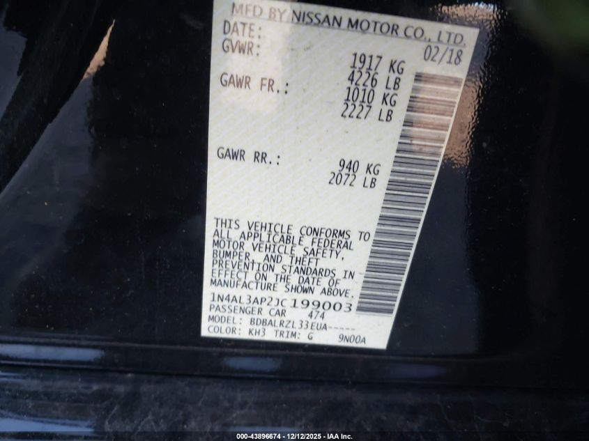 Цвет ЧерныйЦилиндры 4Привод Передний приводVIN 1N4AL3AP2JC199003Состояние Заводится и едет (проверено)Повреждения Передняя или задняя AutoRIA