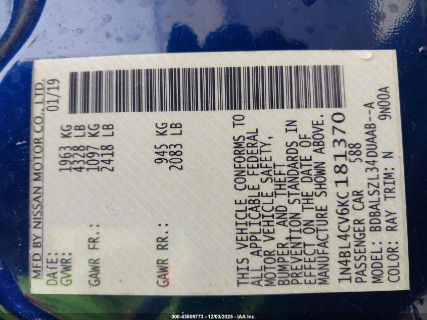 2019 NISSAN ALTIMA 2019 року Бензин, 2.5, Передний привод, vin - 1N4BL4CV6KC181370 из США