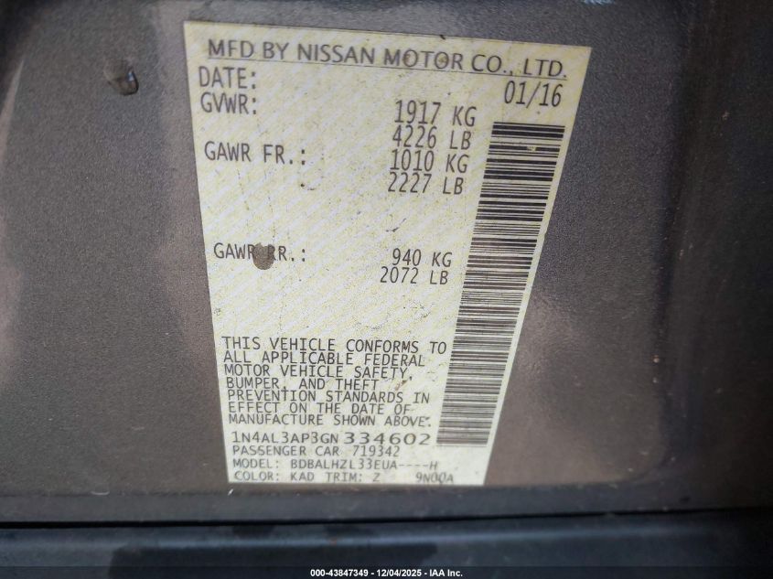 Цвет СерыйЦилиндры 4Привод Передний приводVIN 1N4AL3AP3GN334602Состояние Заводится и едет (проверено)Повреждения Передняя левая AutoRIA