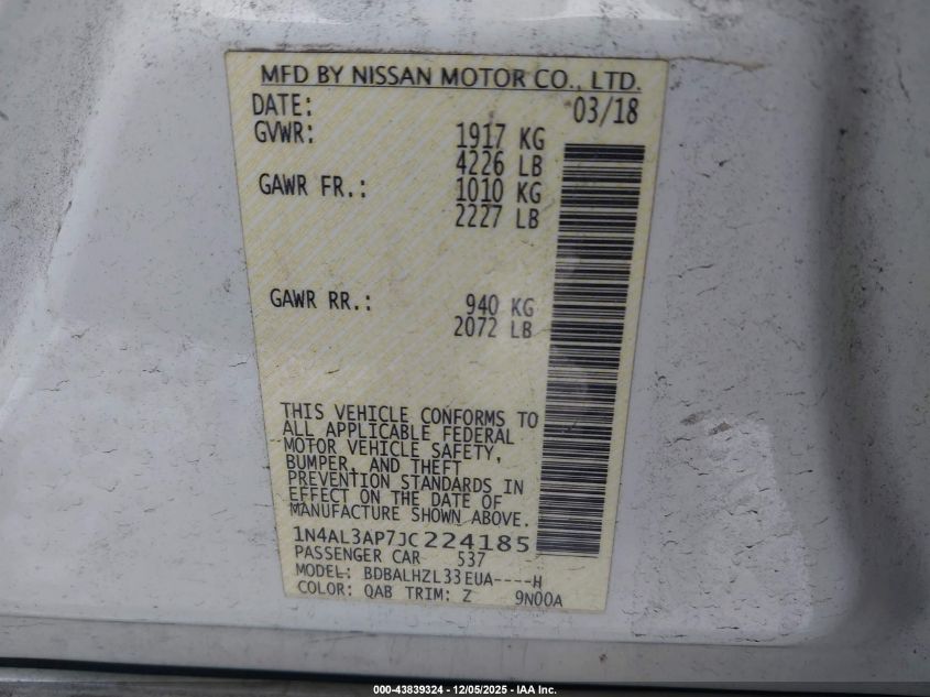 Цвет БелыйЦилиндры 4Привод Передний приводVIN 1N4AL3AP7JC224185Состояние Заводится и едет (проверено)Повреждения Пожар двигателя AutoRIA