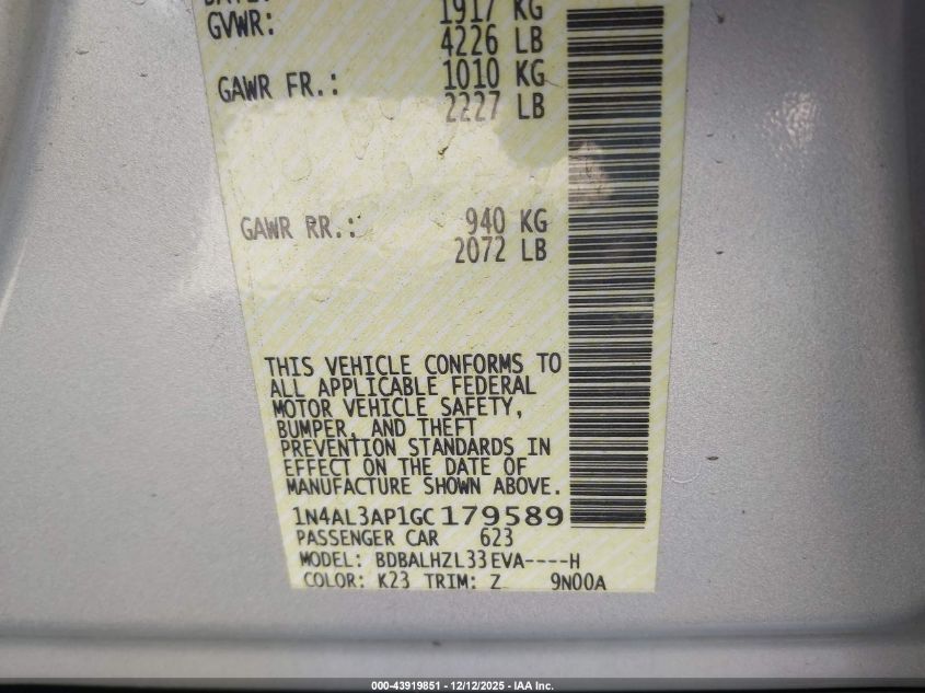 Цвет СеребряныйЦилиндры 4Привод Передний приводVIN 1N4AL3AP1GC179589Состояние СтационарноПовреждения Передняя или задняя AutoRIA