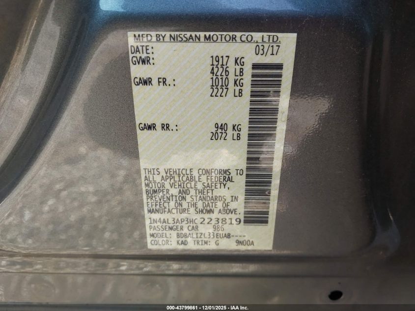 2017 NISSAN ALTIMA 2017 року Бензин, 2.5, Передний привод, vin - 1N4AL3AP3HC223819 из США
