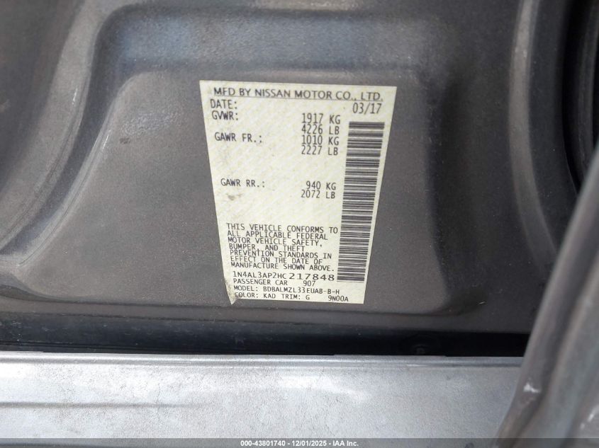2017 NISSAN ALTIMA 2017 року Бензин, 2.5, Передний привод, vin - 1N4AL3AP2HC217848 из США