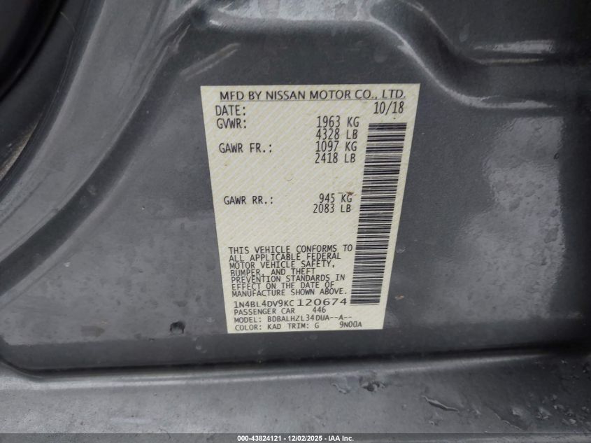 2019 NISSAN ALTIMA 2019 року Бензин, 2.5, Передний привод, vin - 1N4BL4DV9KC120674 из США