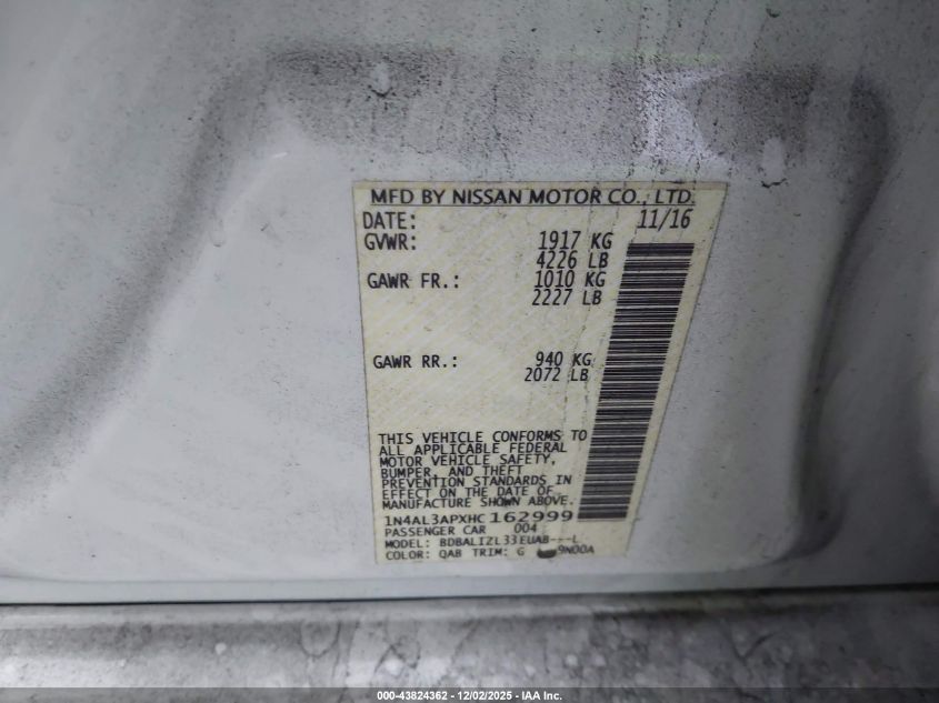 2017 NISSAN ALTIMA 2017 року Бензин, 2.5, Передний привод, vin - 1N4AL3APXHC162999 из США