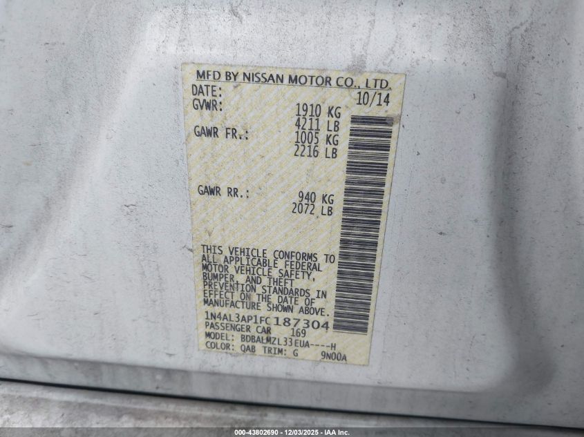 2015 NISSAN ALTIMA 2015 року Бензин, 2.5, Передний привод, vin - 1N4AL3AP1FC187304 из США