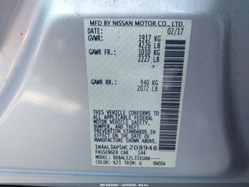 2017 NISSAN ALTIMA 2017 року Бензин, 2.5, Передний привод, vin - 1N4AL3AP5HC208948 из США