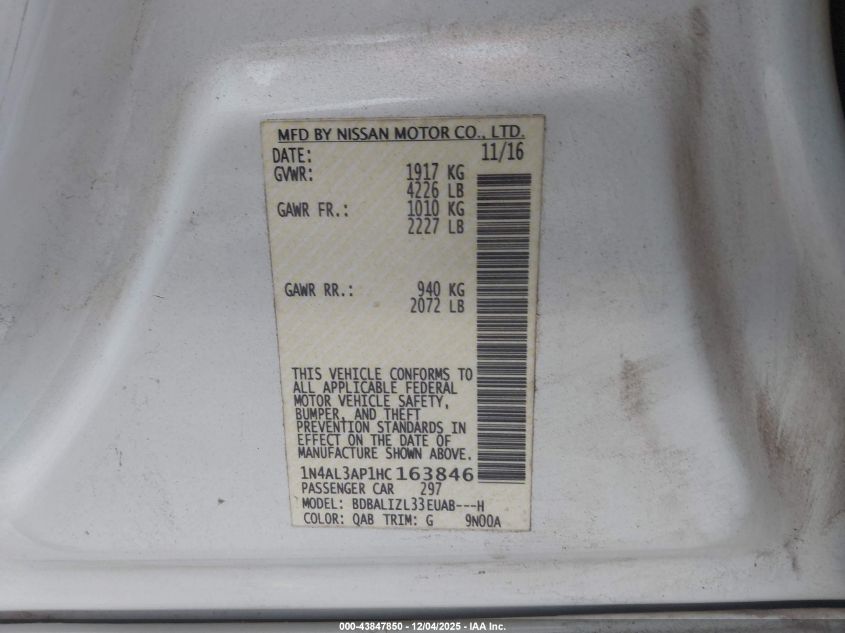 2017 NISSAN ALTIMA 2017 року Бензин, 2.5, Передний привод, vin - 1N4AL3AP1HC163846 из США