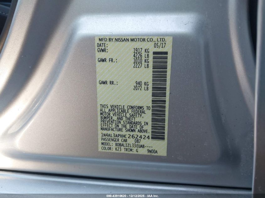 2017 NISSAN ALTIMA 2017 року Бензин, 2.5, Передний привод, vin - 1N4AL3APXHC262424 из США