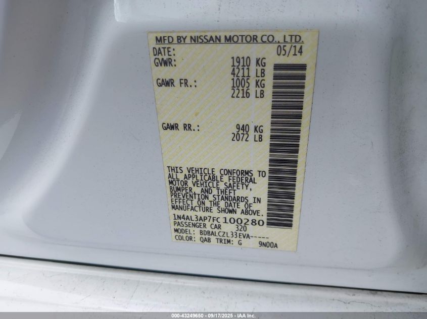 2015 NISSAN ALTIMA 2015 року Бензин, 2.5, Передний привод, vin - 1N4AL3AP7FC100280 из США