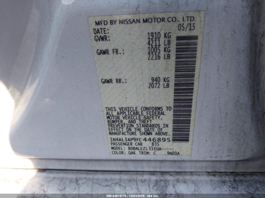 2015 NISSAN ALTIMA 2015 року Бензин, 2.5, Передний привод, vin - 1N4AL3AP9FC446895 из США