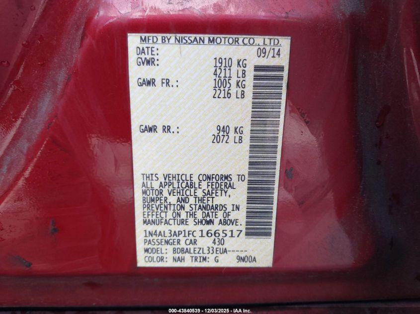 Цвет КрасныйЦилиндры 4Привод Передний приводVIN 1N4AL3AP1FC166517Состояние ЗаводитсяПовреждения Правая сторона AutoRIA