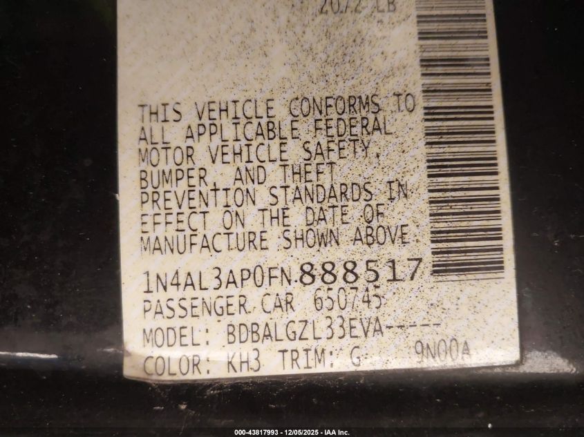 Цвет ЧерныйЦилиндры 4Привод Передний приводVIN 1N4AL3AP0FN888517Состояние СтационарноПовреждения Передняя или задняя AutoRIA
