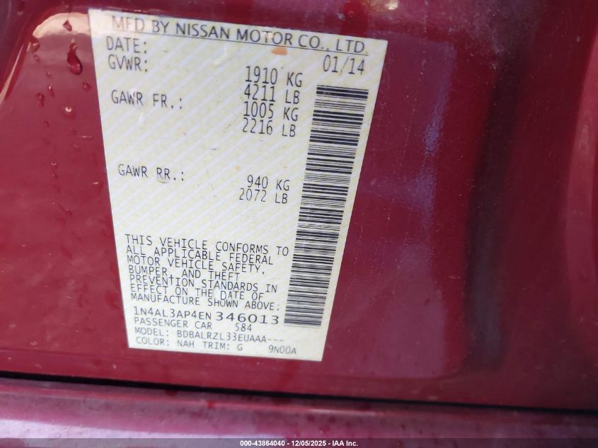 2014 NISSAN ALTIMA 2014 року Бензин, 2.5, Передний привод, vin - 1N4AL3AP4EN346013 из США