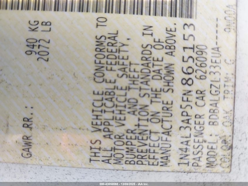 Цвет БелыйЦилиндры 4Привод Передний приводVIN 1N4AL3AP5FN865153Состояние Заводится и едет (проверено)Повреждения Задняя левая AutoRIA