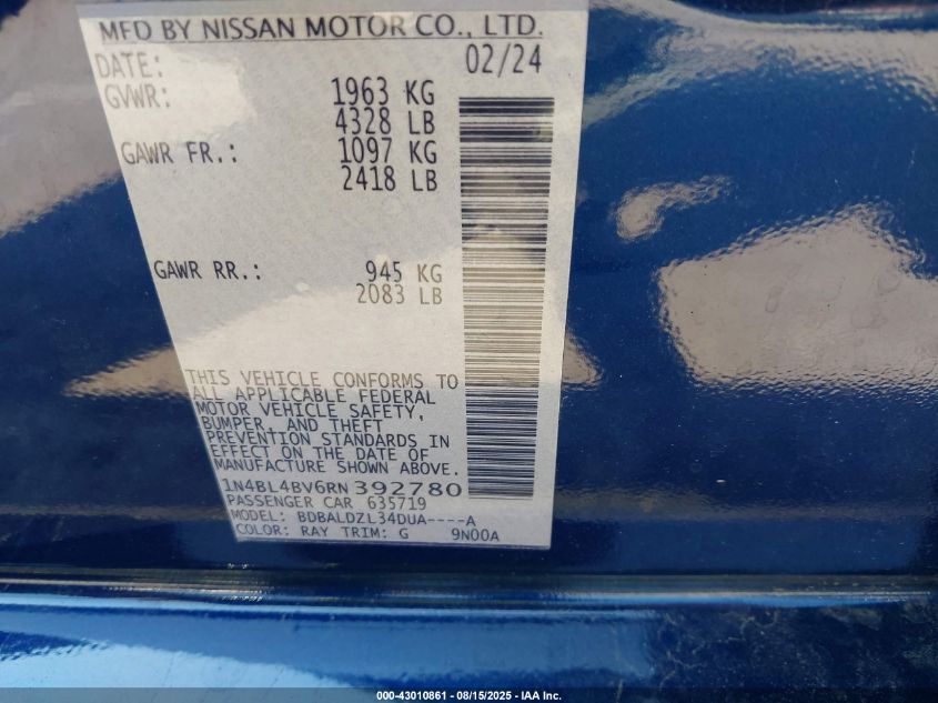 2024 NISSAN ALTIMA 2024 року Бензин, 2.5, Передний привод, vin - 1N4BL4BV6RN392780 из США
