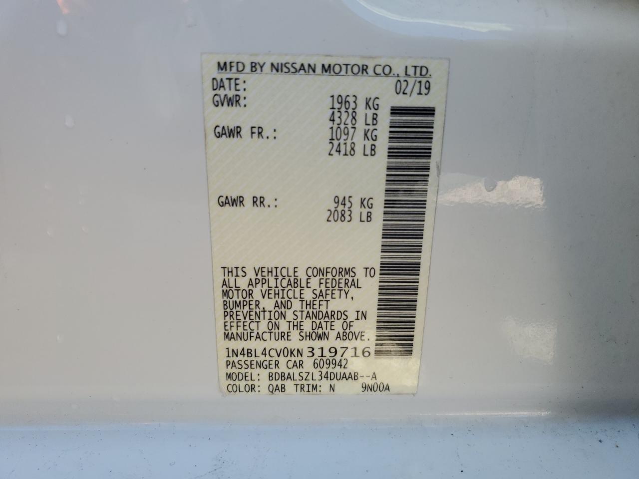 Цвет БелыйЦилиндры 4VIN 1N4BL4CV0KN319716Состояние Заводится и едет (проверено)Повреждения Передняя или задняя AutoRIA