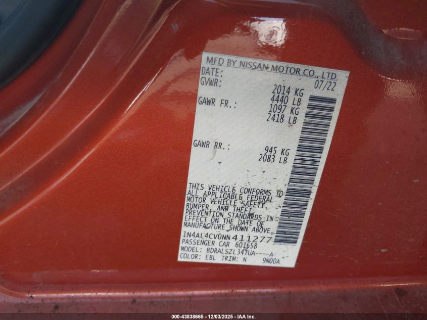 2022 NISSAN ALTIMA 2022 року Бензин, 2.0, Передний привод, vin - 1N4AL4CV0NN411277 из США