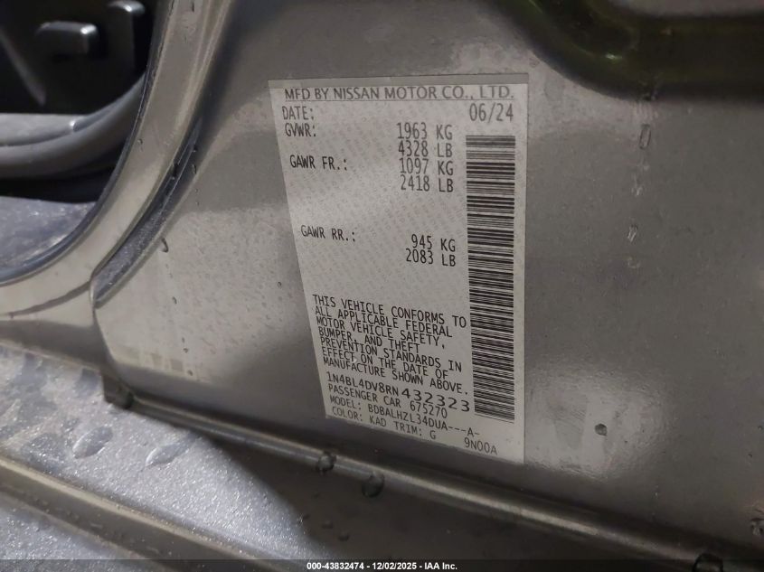 2024 NISSAN ALTIMA 2024 року Бензин, 2.5, Передний привод, vin - 1N4BL4DV8RN432323 из США