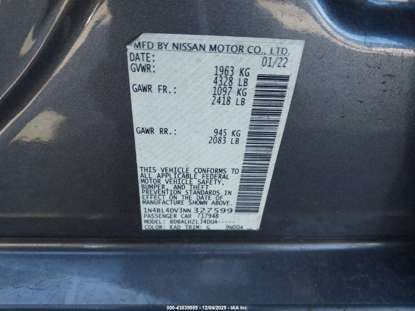 2022 NISSAN ALTIMA 2022 року Бензин, 2.5, Передний привод, vin - 1N4BL4DV3NN327599 из США